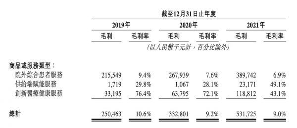 虽然供给端赋能服务和创新医疗健康服务的毛利率相对较高,2021年分别为49.1%及43.1%,但由于收入占比极小,2021年两业务合计仅占总收入5.4%,目前不足以带动整体毛利率大幅提升。