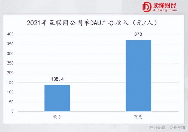 广告收入与广告时长不匹配的原因是,快手单个用户广告变现价值较低。2021年,快手每DAU平均广告收入为138.4元/人,由于字节未披露相关数据,很难将快手与抖音直接对比。但即使与其它互联网公司相比,快手单用户广告变现仍存在差距。以百度为例,2021年百度每DAU平均广告收入为370元/人。考虑到,业内普遍认为字节广告变现强于百度,快手与抖音的单个用户广告变现价值差距应该会更大。