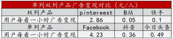 实际上,将全球平台对比来看,双列广告产品广告变现效率均低于单列。