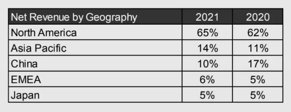 2021全年,来自亚太地区、中国大陆、EMEA(欧洲、中东和非洲)和日本的收入分别占总净收入的14%、10%、6%和5%,值得关注的是来自中国大陆的营收占比继续下降,从2020年的17%跌至2021年的10%,这也可以从侧面看出苹果以及北美地区公司吃掉了过去华为的部分订单需求。