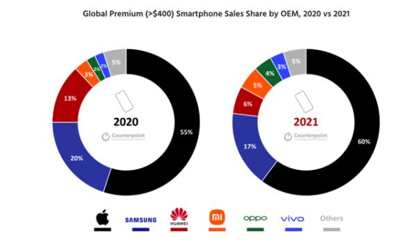 2020年与2021年全球高端智能手机品牌的销售份额;来源:Counterpoint