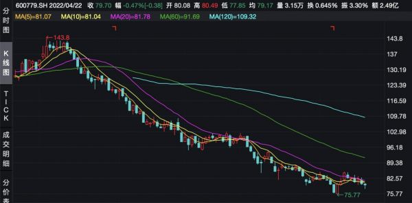 钛媒体APP发现,1月26日水井坊进行业绩预披露当天,股价报收104.39元/股,而截至4月22日年报披露日,水井坊股价已下跌23.65%至79.7元/股。与2021年12月初的143.8元/股高位相比,水井坊股价已接近腰斩。