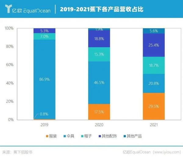 2019年,蕉下伞具、服装和帽子的营收占比分别为86.9%、0.8%和7.0%。2021年,蕉下伞具占比下降到20.8%,服装变成第一大品类,占比29.5%;帽子占比18.7%。