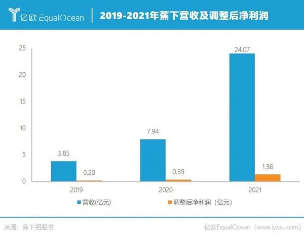 招股书显示,蕉下近年来营收迅速增长,从2019年的3.8亿元增长至2021年的24.1亿元,年复合增长率达150.1%。