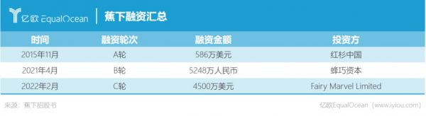 十年内蕉下只进行了3次融资。2015年11月,蕉下获数百万美元A轮融资,投资方为红杉中国;2021年4月,公司引入蜂巧资本;2022年2月,蕉下获得Fairy Marvel Limited的新一轮融资。
