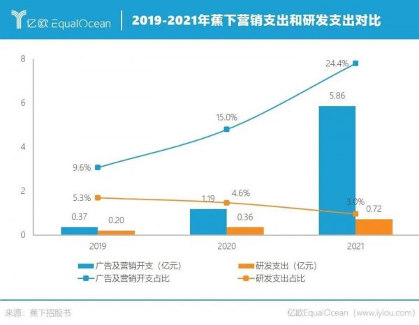 招股书显示,2019-2021年广告及营销开支占比远超其他项目,分别为0.37亿元、1.19亿元和5.86亿元,占总收入的比例分别为9.6%、15.0%和24.4%,急剧飙升。