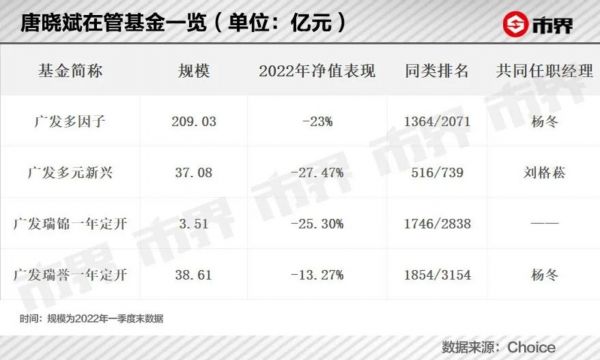 不过,新发基金的表现差强人意。截至2022年4月22日,广发瑞锦净值0.7784元,较成立时下跌22.16%;广发瑞誉净值0.8553元,较成立时下跌14.47%。唐晓斌2022年一季度在管规模也随着净值下跌缩水至288亿元。