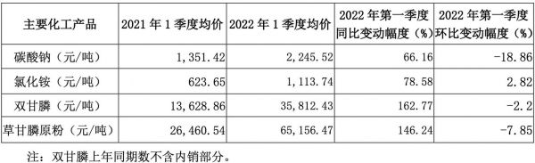 业绩连续增长,主要得益于主营产品纯碱、草甘膦/双甘膦、氯化铵等价格上涨。经营数据显示,今年一季度公司纯碱(碳酸钠)均价2245.52元/吨,同比增长66.16%,环比去年Q4下降18.86%;双甘膦35812.43元/吨,同比增长162.77%,环比下降2.2%。