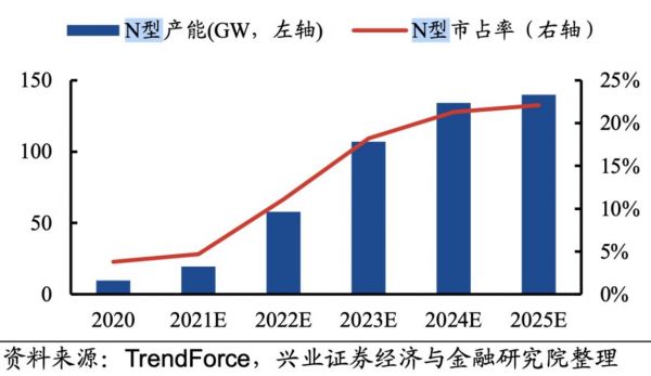 (N型电池市场份额不断提升,来源:兴业证券研报)