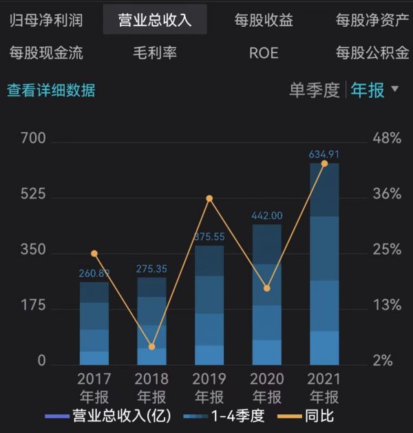 通威股份近几年营收走势,来源于wind