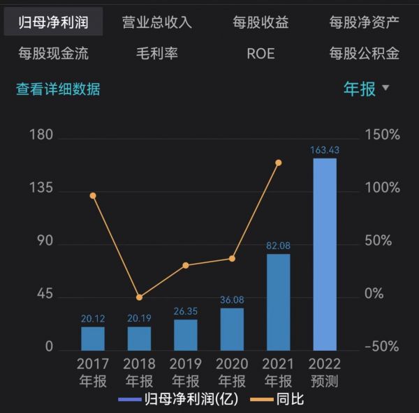 通威股份近几年净利润走势及2022年净利预测,来源于wind