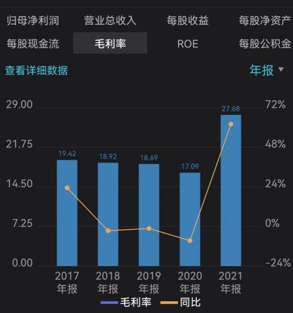 通威股份近几年毛利率走势,来源于wind