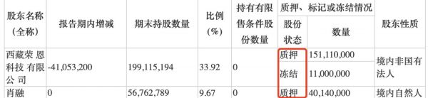 值得一提的是,青海春天忙于押注高端白酒的同时,其实控人也忙着质押公司股票。钛媒体APP注意到,截至目前,青海春天控股股东西藏荣恩及其一致行动人肖融共持有公司股份2.56亿股,占公司总股本的43.59%,累计质押数量已达到1.91亿股,占其合计持股总数的74.74%,占公司总股本的32.58%。同时西藏荣恩还有1100万股的股票处于冻结状态。
