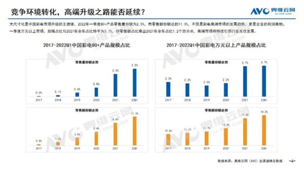 “但80+市场零售额占比达到11.3%;万元以上市场零售额占比达到18.2%。产品结构升级是彩电行业的确定性道路。”奥维云网直言,目前的电视竞争已经向大尺寸倾斜,人工智能、远场语音等AI属性成为新品标配,新技术或将引领未来方向。