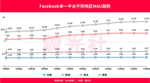 去年第四季度,其日活用户数首次出现环比下降,在不同地区月活用户的增长速度也趋于放缓。特别是在年轻群体中,Facebook的受欢迎程度直线下降,自2019年以来美国的青少年用户数量下降了13%,预计未来两年将进一步下降45%……