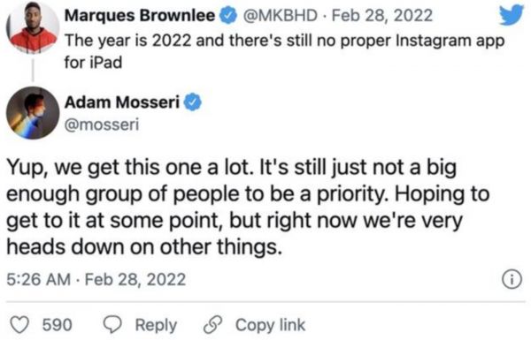 前不久,多位网友发帖吐槽,“都2022年了Instagram还没有适配iPad”。Instagram高管Adam给出的答复是,“我们经常收到这样的信息,但没有足够多的用户让此成为优先事项”。言外之意,这不值得做。