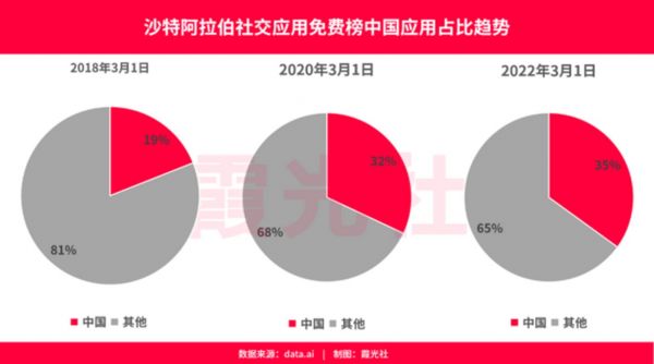 2018年3月1日,有19款中国应用进入沙特阿拉伯的社交应用免费下载榜Top100,到了2022年3月1日,这一数字上升至35款,前10名里更是占据6席。而在社交应用畅销榜中,这一数字从2018年的26款上升至如今的48款。