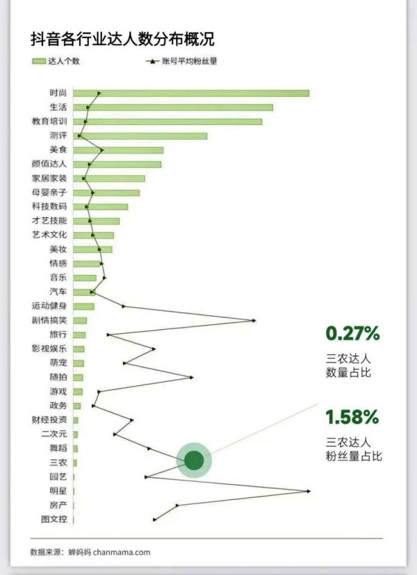 即便如此,对比其他竞争激烈的领域,三农创作者的数量九牛一毛。蝉妈妈《抖音三农行业分析报告》数据显示,从2021年到2022年第一季度,抖音各行业达人数分布中,时尚、生活、教培领域位居前三,三农达人数量占比仅0.27%,三农达人粉丝量占比1.58%。