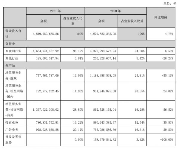 在不断的投资中,昆仑万维的主营业务也经常变更。大多数人谈起昆仑万维,都以为它是一只游戏股,但从其目前收入来源看,游戏早已不是主营业务。截至报告期末,社交娱乐、广告、搜索、及游戏等各项收入在营业收入中占比分别为43.70%、20.17%、16.22%、16.04%,游戏已经排在了第四位,所贡献的收入也较2020年减少35.16%。海外社交网络业务取而代之,成为了目前公司收入占比最大的业务。