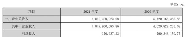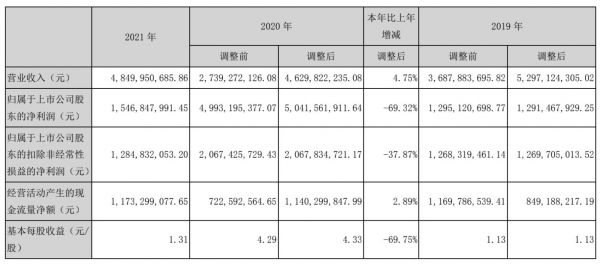 由上表数据来看,2020年调整前营业收入较2019年下滑25.7%,而2021年公司营收为48.5亿元,较上年的46.3亿元增长4.7%。但从合并利润表来看,事实上2021年公司营业总收入48.5亿元较2020年的54.2亿元下降10.5%。同时,报告期内公司归母净利润大幅下滑69.3%,也就是说2021年公司营收和利润均出现了双位数下滑。