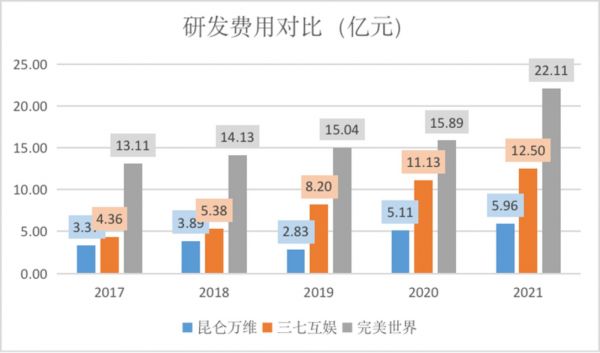 然而作为科技互联网出海企业,昆仑万维的研发却投入较少。虽然研发费用较2021年较上年提升了16.7%,达到5.96亿元,但与同行比起来差距较大。以三七互娱和完美世界为例,昆仑万维的研发费用仅有完美世界的四分之一左右,可见公司对游戏开发确实不算上心。