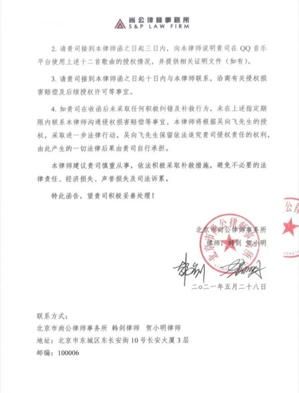 吴向飞告诉《财经·伽玛刀》,2021年6月1日,他的律师函分别送达腾讯音乐和网易云音乐。腾讯音乐很快联系上了吴向飞,并告知后者,环球音乐已通知腾讯音乐,环球音乐与吴向飞的合约到期了,不再代理他的作品。