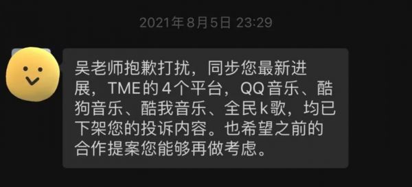 吴向飞更无法接受的是,2021年8月5日半夜,腾讯音乐版权部门一位代表在微信知会吴向飞,腾讯音乐旗下四个平台已经下架了其投诉的内容。但在8月13日一早,经一位陈奕迅歌迷提醒后,吴向飞发现陈奕迅演唱的《路一直都在》、《臭美》等歌曲又在QQ音乐上架了。