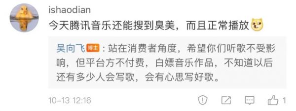 就在吴向飞的微博里,一位音乐人给他私信里说,“维权的事儿,大家得抱团发声。”