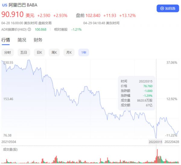 回看阿里的股价,在2020年11月到达巅峰,约为298美元/股,而到了现在,阿里股价最低仅有76美元左右,下跌幅度约为70%,根据最新市值计算,约1年半的时间,阿里的市值蒸发约6200亿美元。