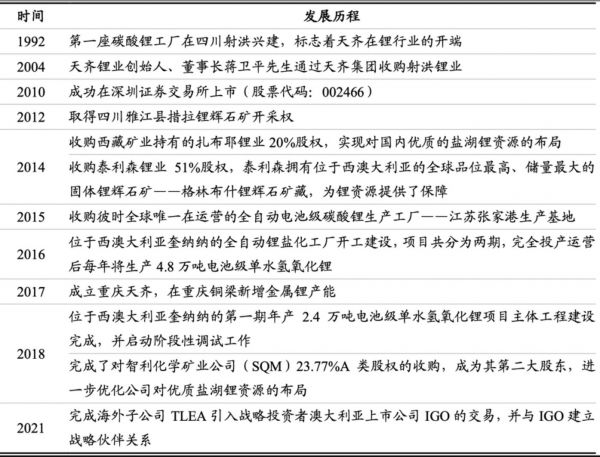 谈到公司的锂矿资源还得从头说起。天齐锂业始建于1992年,第一座碳酸锂工厂在四川射洪兴建;2004 年,蒋卫平通过天齐集团收购射洪锂业;2012年,天齐锂业登陆深交所,此后开启全球化锂矿布局并拓展锂产业链。