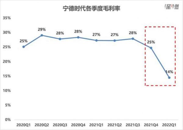 这也非常直观地体现在了毛利率的变化中。在宁德时代的成本构成中,直接材料的占比超过 75%。过去两年来,宁德时代每个季度的毛利率,都维持在25%以上,但是今年一季度,直接降到了14%。