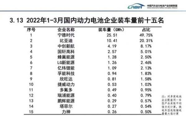 根据中国汽车动力电池产业创新联盟的数据,今年1-3月,国内动力电池企业装车量排第一的是宁德时代,市场份额49.75%,这比2021年的52.1%下降了2.35%,第二名的比亚迪,市场份额从16.2%上升至20.31%,其他头部玩家的份额也有不同程度的上升。