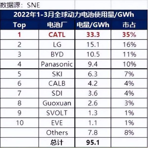 韩国市场研究机构SNE Research的最新数据显示,今年1-3月,宁德时代市占率为35%,排全球第一,LG新能源为16%,排第二,但大幅落后于宁德时代。2021年底,宁德时代和LG新能源的市占率分别为32.6%、20.3%。一升一降,二者差距进一步拉大。