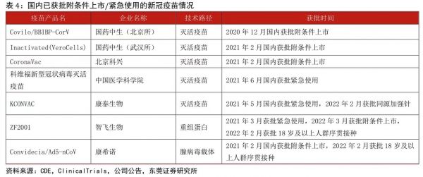 目前,国内共批准了7款新冠疫苗产品上市,分别来自国药中生武汉所、北京所、北京科兴、智飞生物、康希诺、康泰生物以及中国医学科学院医学生研究所,其中5款为灭活疫苗,1款为重组蛋白疫苗,1款为腺病毒载体疫苗。