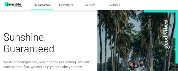 试想一想:你存了几个月的钱准备去度过一个有趣的假期,但是因为暴雨,你不得不在 Airbnb 里呆了一整个假期,这听起来是不是令人崩溃?「Sensible Weather」将为旅客打造一款天气保险来解决这个问题:“Sunshine, Guraranteed” 是他们的 Slogan,只要你支付了天气保险单,你的旅行因为天气受到影响,「Sensible Weather」就会予以适当的赔偿。