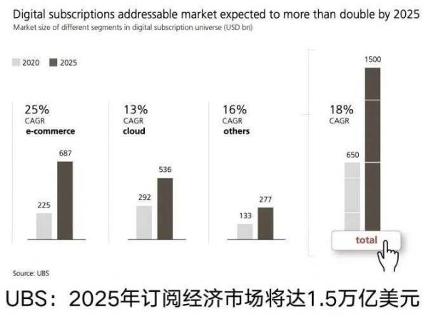 数据层面看,根据瑞银的研究报告,全球 2020 年订阅经济规模是 6500 亿美元,到 2025 年将达到 1.5 万亿美元的规模,年均复合增长率达到 18%。按照全球的 GDP 规模 100 万美元看,订阅经济将占到全球 GDP 的 1.5%,对于几百年以来以交易产品为主的模式来讲,这是不小的进步。