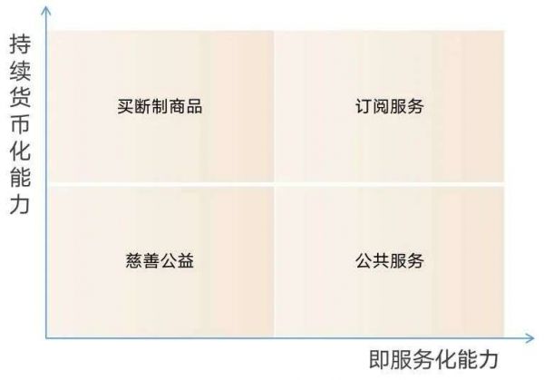 按照两个轴的数值高低,简单区分出来四个区域,分别代表了四种产品形态:买断制商品、订阅服务、慈善公益、公共服务。