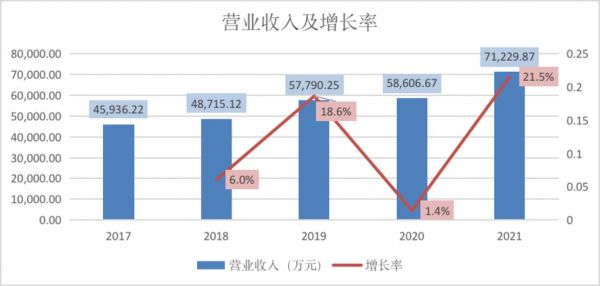 随着公司业务规模的扩大,鼎欣科技的营业收入近5年一直呈稳定增长趋势。2021年,公司营收、净利均实现双位数增长,其中营业收入为7.12亿元,同比增长21.54%,净利润为5467万元,同比增长23.61%。