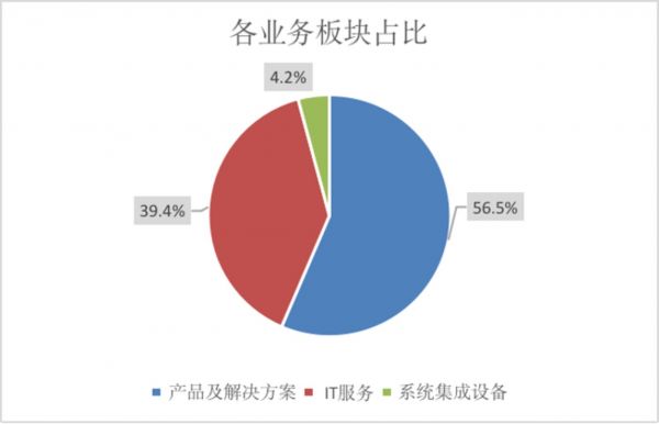公司主营业务分为三大板块,分别为IT服务、产品及解决方案以及系统集成服务。目前解决方案占收入的半壁江山,达到56.5%;IT服务为第二大业务,占比为39.4%;系统集成占比最小,为4.2%。2021年,这三块业务均实现了不同程度的增长,其中,IT服务收入较上年增长9.65%,解决方案收入较上年增长22.42%,系统集成由于2020年基数较小,增长率达1555.84%。