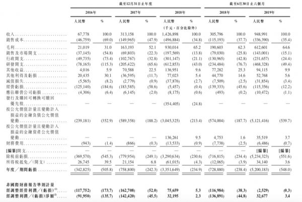撇除管理层认为不能反映经营表现的项目的影响,旷视方面给出经调整后的净利润/亏损分别为:2016年净亏损0.92亿元,2017年净亏损1.42亿元,2018年净利润为1.37亿元,2019年上半年净利润为0.33亿元。总的来说,经调整后的净利润/亏损与实际净利润/亏损差距较大。