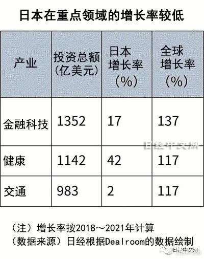 按产业领域来看,在全球重点投资对象领域,日本的增长率明显落后。在全球投资总额超过10万亿日元的金融科技、健康和交通这3个领域,对比2018~2021年的增长率,日本仅为2~42%。而世界平均增长率高达117~137%。