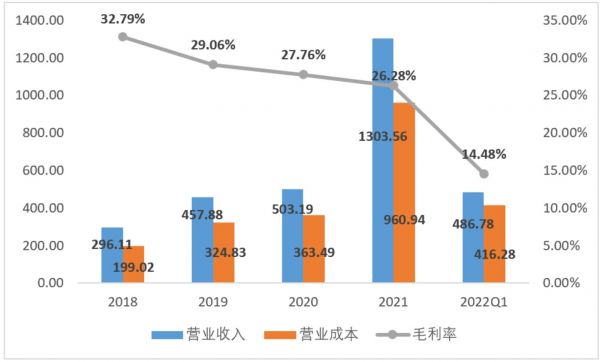 2022年一季度公司营业收入达到486.78亿元,较2021年一季度的191.67亿元同比增长153.97%,同期营业成本从2021年一季度的139.38亿元提高至416.28亿元,同比增长198.66%,成本增速大幅超过营收增速也导致公司毛利率大幅下降,2022一季度宁德时代毛利率14.48%,同比下降12.8%,环比下降10.22%。