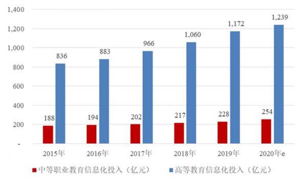 数据显示,2013年-2019年期间,中国教育信息化市场规模由2693亿元增长至 4368亿元,年复合增长率为8.40%,预计2021年市场规模将增加至5025亿元。按高等教育、中等职业教育经费投入占全国教育经费总投入的比重测算,2015年-2019年期间,高等教育信息化投入由836亿元增加至1172亿元,中等职业教育信息化投入由188亿元增加至228亿元。