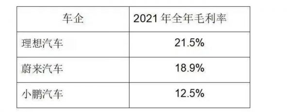 另外一方面,理想汽车一直以来以“抠门”著称,精于成本控制,由于蔚来和小鹏的一季报当下并未公布,我们无法进行一季度毛利率进行对比,不过2021年三家厂商年报的毛利率对比,也可见一斑。
