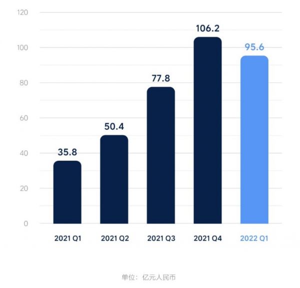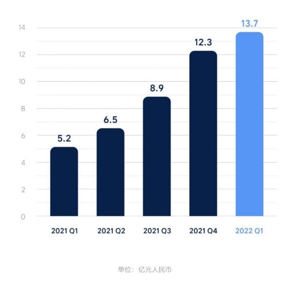 净利润方面,2022 年第一季度的毛利为人民币 21.6 亿元(3.413 亿美元),同比增长 250.9%。