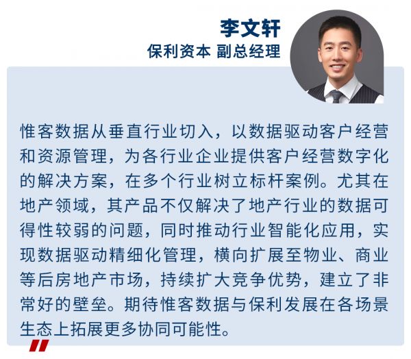 “惟客希望能在保利资本的加持下,不断强化产品研发能力,深化行业积累,更好地解决地产行业数据可得性较弱、数据应用能力较弱等问题,共同推动产业升级,助力更多中国企业引领世界。”惟客数据CMO劳汉华表示。