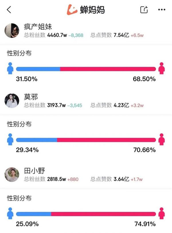 蝉妈妈数据显示,疯产姐妹的视频观众,68.5%为女性,男性占比则为31.5%。莫邪与田小野的男女粉丝比例,也在3:7左右。另外几个有一定粉丝量的闺蜜账号,如七牛闺蜜、我和闺蜜的日常等,也在这个比例上下浮动。