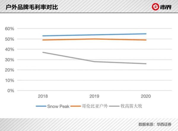 Snow Peak成立于1958年,2014年上市。据华西证券报告,2018-2020 年,Snow Peak毛利率持续高于哥伦比亚户外以及牧高笛旗下大牧品牌。