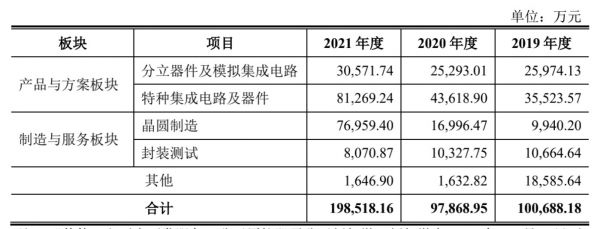 2021年公司实现营收20.4亿元,同比上升97.6%。从业务板块来看,2020年之前,燕东微的业务还主要为集成电路及分立器件制造和系统方案,不过2021年开始,公司的晶圆制造业务迅速攀升,收入较上年暴增4.5倍。不难看出,公司目前把精力聚焦于特种集成电路和晶圆制造两项业务上,这两个业务在2021年分别占营收的40.9%、38.8%,增速分别达到86.5%、352.9%。