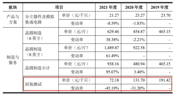 从毛利率来看,产品与方案板块较为稳定。而制造与服务板块中,晶圆制造业务因生产线逐渐达产毛利率转正,封装测试业务的毛利率不但没转正,反而出现下滑,近三年的毛利率分别-24.41%、-8.41%及-19.92%,主要原因是公司封装测试产线还未完全达产、单位成本较高。另外,封装测试产品单价逐年下滑,也是其毛利率迟迟无法转正的原因。